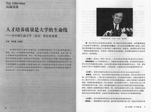 本科教育体现了大学的不可替代性,本科教育质量则是一所大学办学质量的核心体现。因此,如何提高本科教育质量,尤其是如何提高人才培养质量,就成了每一所大学都需要认真思考的问题。由中国教育科学研究院出版的《大学》(学术版)围绕此问题对中国石油大学(北京)校长张来斌进行了专访,并在2011年第11期高端访谈栏目中刊登了专访文章——《人才培养质量是大学的生命线——访中国石油大学(北京)校长张来斌》。