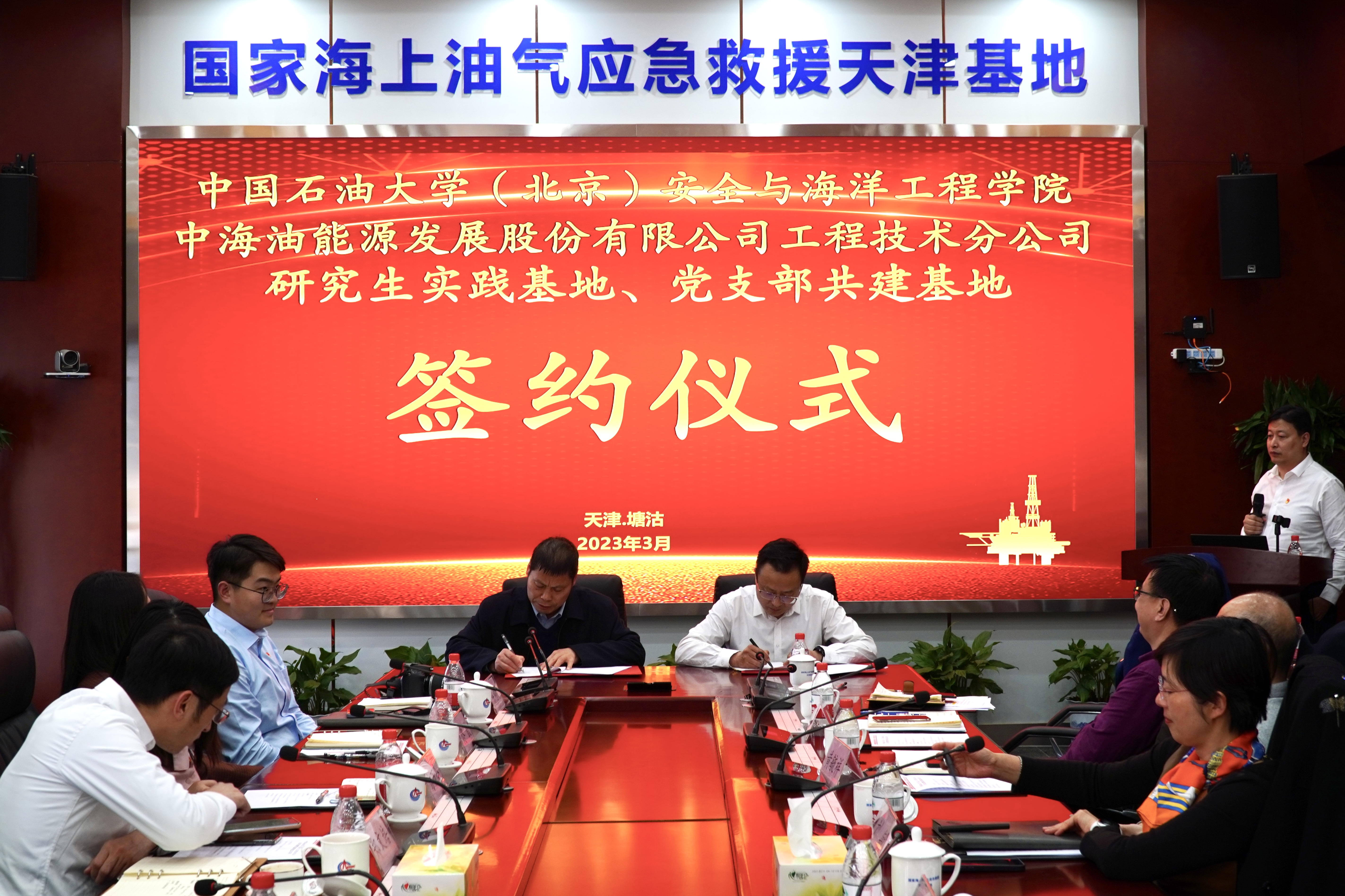 为深入学习贯彻党的二十大精神,积极探索党建引领下院企产教融合、协同育人的创新模式,3月2日,中国石油大学(北京)安全与海洋工程学院副院长、深海工程创新团队党支部书记杨进带队前往中海油能源发展股份有限公司工程技术公司开展共建交流,签订校企党支部结对共建协议和研究生实践培养协议,并为井控中心与安全学院实习实践基地揭牌。