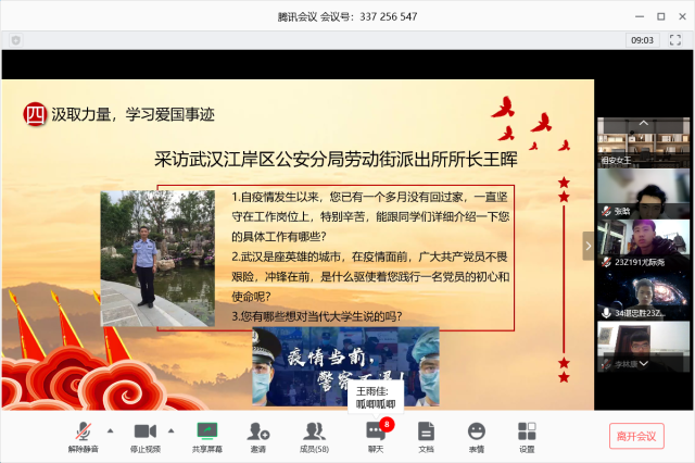 本次“云班会”远程连线武汉市公安局江岸分局劳动街派出所所长王晖、武汉蔡甸区蔡甸街办事处正街社区党委副书记龚姣姣和战“疫”志愿者――中国地质大学(武汉)自动化类专业23Z191班肖纬琦同学,与同学们分享战 “疫”故事、讲述爱国情怀、共话青春担当,并邀请中石大马克思主义学院曹培强教授作为点评嘉宾,对比国内外抗疫所采取的态度、措施和效果,进一步坚定青年学生“四个自信”。