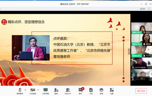 听完疫情一线工作者和同学们的分享后,曹培强教授对本次“云班会”进行了点评。他说:“这是一场特殊的班会,特殊的时刻、特殊的形式、特殊的内容、特殊的群体。经历过2003年‘非典’的我,对于这次的活动特别有感触。人来到世界上有三个母亲――养育自己的妈妈、培养自己的母校与自己的祖国母亲。在这场疫情中,祖国母亲遇到特殊的事件,千万个母亲送出孩子,参与到这场重大的疫情阻击战中。社区党委副书记龚姣姣和肖纬琦同学母女齐上阵、共抗疫,在平凡的岗位上做出了不平凡的事情,体现出家的母爱、国的情怀。爱国是具体、深沉、多样的,无论是参加群众游行还是在一线抗击疫情,都是爱国的具体表现。经过疫情的考验、全民的努力,我们对社会主义制度的自信将是发自内心的。对比中外应对疫情采取的不同态度、措施和效果,更加彰显了中国特色社会主义制度的优越性。这次疫情让我们都受到了一次洗礼,大道之行、天下为公。青年大学生将会更加勇于承担民族复兴的大任,在新的挑战面前毫不畏缩、负重前行!”