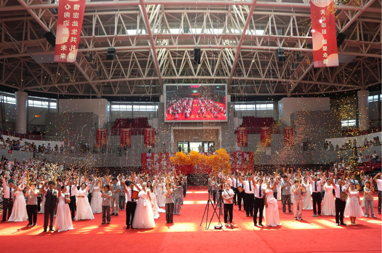 6月28日,“天山缘起 疆爱永恒”情牵中石大集体婚礼在克拉玛依校区红山湖体育馆举行,55对在新疆这片热土建功立业并喜结良缘的伉俪重返母校,共同举行结婚典礼。