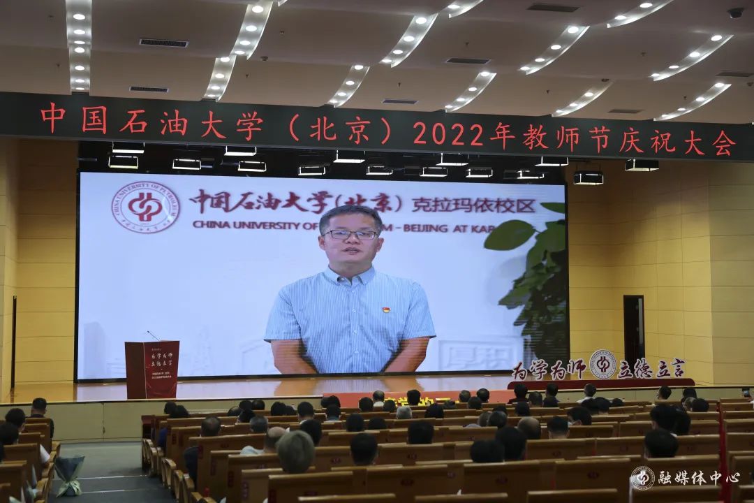 9月9日下午,在第38个教师节来临之际,中国石油大学(北京)2022年教师节庆祝大会在中油大厦三层报告厅隆重举行。校领导陈峰、吴小林、雷玉江、鲍志东、金衍、文永红、张广清与全体正处级干部、退休教师代表、获表彰教师代表、新入职教师代表和学生代表200余人欢聚一堂,共同见证中石大教师的光荣时刻,副校长,克拉玛依校区党委书记、校长梁永图及校区全体干部、教职工在校区分会场线上参会。校长吴小林主持庆祝大会。