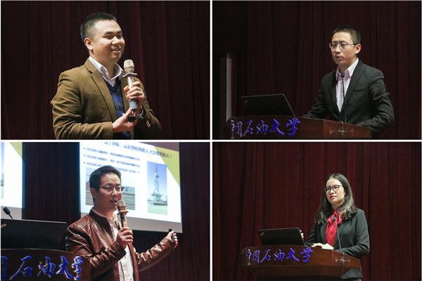 报告会上,现就职于中海石油(中国)有限公司天津分公司渤海石油研究院的刘东以“认知和行为:献给我的母校——中国石油大学”为题,分享了他成长道路上的切身体会,讲述了在家境困难情况下凭着顽强的毅力克服重重磨难顺利完成学业的经历,嘱咐同学们常怀感恩之心,常葆豁达乐观心态,勇敢面对人生挑战。陕西省延安市吴起县庙沟镇镇长助理兼吴水口村驻村工作队队长、现借调到延安市委组织部研究室工作的李伟以“民族复兴路上的‘新知青’”为题,分享了自己从知名石油外企辞职后从“高楼大厦”到“田间地头”、从“上山抓羊”到“发展果业”、从“智力扶贫”到“电商扶贫”,帮助家乡村民脱贫致富的基层工作经历,体现了石大毕业生扎根基层、服务基层的优秀品质。现就职于中国石油塔里木油田油气工程研究院的曹立虎以“牢记嘱托,为梦想而前行”为题,讲述了入职后在油田一线做钻井队场地工、泥浆工、井架工、工程师、泥浆工程师的工作经历,及利用大学所学为油田解决生产实际问题开展科研工作的历程,彰显了石油学子为油田发展、石油行业发展贡献力量的决心。正在北京接受对外汉语培训、即将去澳大利亚的孔子学院任教的张维以“选对一条路”为题,分享了自身求学期间严格要求自己、坚持刻苦学习、专注地质研究、注重国际交流、学业精益求精、热心志愿服务、提升综合素质的人生经历,表示到国外工作后将尽己所能传播中国文化。