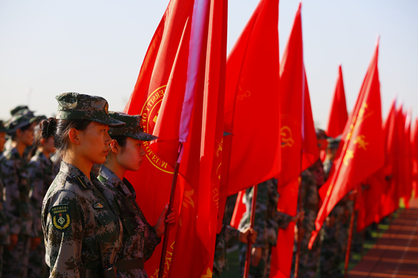 上午10点,军训开训典礼在庄严激昂的国歌声中拉开了序幕,陈桂刚向军训团授旗。
