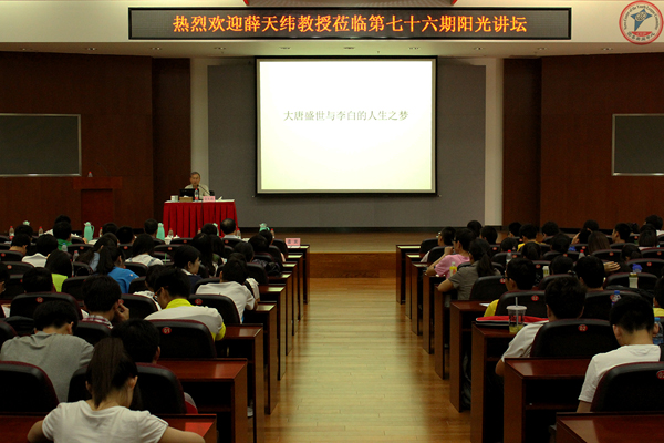 5月22日下午,由校党委主办、校团委承办、校研究生会协办的石大第76期阳光讲坛在翠宫报告厅举行。著名唐诗研究专家、原中国李白研究会会长薛天纬教授应邀做了题为“大唐盛世与李白的人生之梦”的报告,石大党委副书记雷玉江与近300名师生一起聆听了报告。