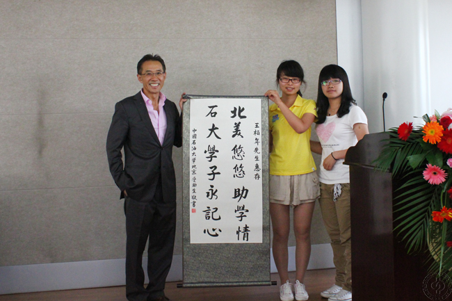 6月7日上午,加拿大北美永新能源有限公司总裁王柏年一行来到中国石油大学续签“永新能源助学金”捐赠协议,并与受资助学生进行了互动交流。党委副书记雷玉江和王柏年分别代表学校及企业在协议上签字,雷玉江向王柏年颁发了捐赠证书。校长张来斌会前会见了王柏年一行。