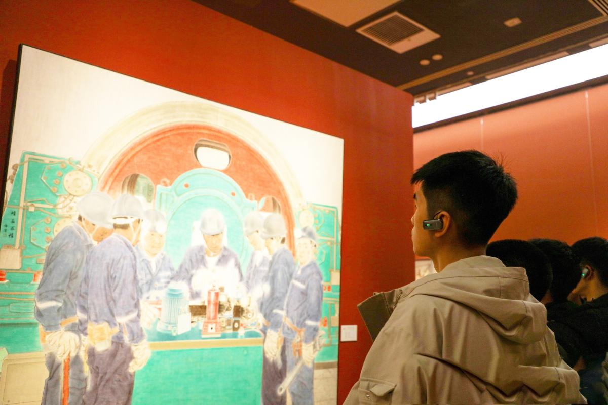 在中国美术馆主展厅,师生们在杨儒老师的带领讲解下,认真学习《金色土地》《休戚与共》《山河颂》等画作创作思路、作品解析,沉浸在优秀文化艺术作品的氛围中。在安静有序的参观过程中,同学们在一幅幅、一件件作品前时而拍照留念,时而低声交谈,时而驻足观望。师生们在《向海图强 逐梦深蓝》等各类体现新时代主题的书画雕塑、工艺美术、壁画作品中流连忘返,共同品鉴美术之韵,感受中国写意、写实等画作的审美意蕴,领略艺术对新时代的展现。