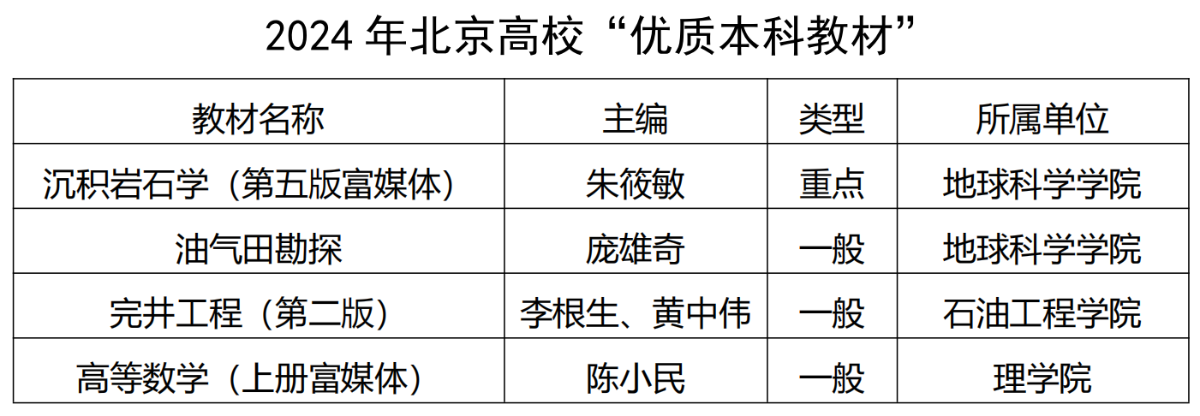 近日,北京市教育委员会相继公布了2024年北京市高等学校教学名师奖、北京高等教育本科教学改革创新项目立项项目名单、北京本科高校产学研深度育人平台评选结果、北京高校“优秀育人团队”“优秀本科实验教学指导教师”“优秀大学生学科竞赛指导教师”“优秀本科教学服务保障人员”“优秀教学实验室”“优质本科课程”“优质本科教案课件”“优质本科教材”的评选结果。中石大共获本科教育教学类项目、奖项31项。