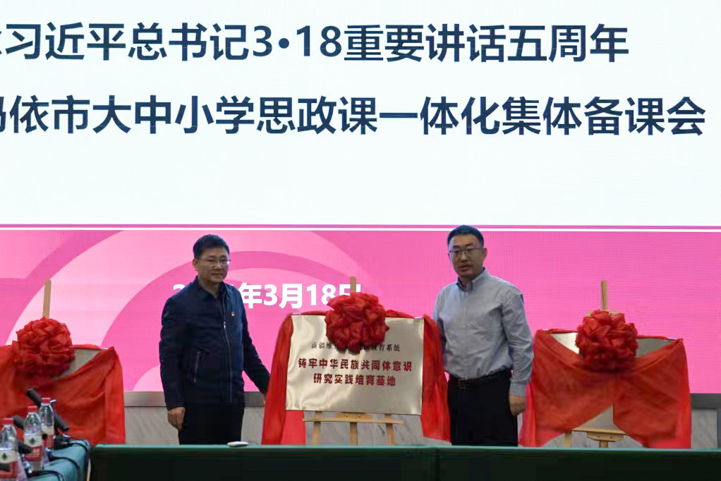 会上,张红艳带领参会人员重温了习近平总书记在学校思想政治理论课教师座谈会上的重要讲话核心内容。唐勇和徐长亮共同为马克思主义学院“铸牢中华民族共同体意识研究实践培育基地”“‘大思政课’实践教学基地”“大中小思政一体化牵头校”三个自治区级建设平台揭牌。