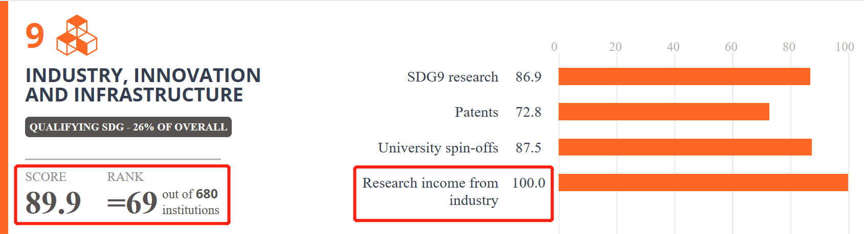 SDG9主要衡量大学在产业和创新方面的研究、专利和衍生公司的数量以及在产业方面的研究收入等方面的表现。在SDG9中,学校总分为89.9分,高于中位值85%,在科研、专利、大学衍生企业、产业收入的分项得分为86.9分、72.8分、87.5分、100分,在产学研用方面继续保持高位发展态势。