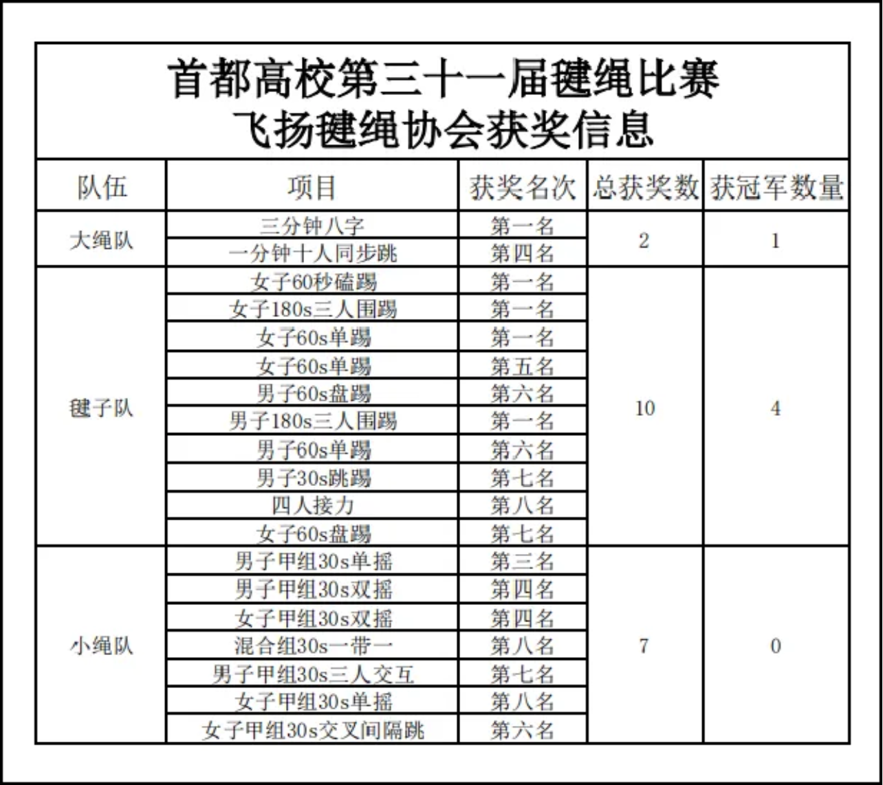 12月1日,首都高等学校第三十一届毽绳比赛在华北电力大学体育馆举行,来自北京大学、中国传媒大学等高校的36支跳绳比赛队伍和30去踢毽比赛队伍参加了本届赛事。中石大毽绳队队员在比赛中表现出色,荣获多项佳绩,个人项目的女子60秒磕踢、女子60秒单踢荣获第一名,团体项目的3分钟8字跑集体长绳项目、女子180秒三人围踢、男子180秒三人围踢均荣获第一名。学校获得毽子团体第四名、跳绳团体第六名的好成绩,并被授予体育道德风尚奖。