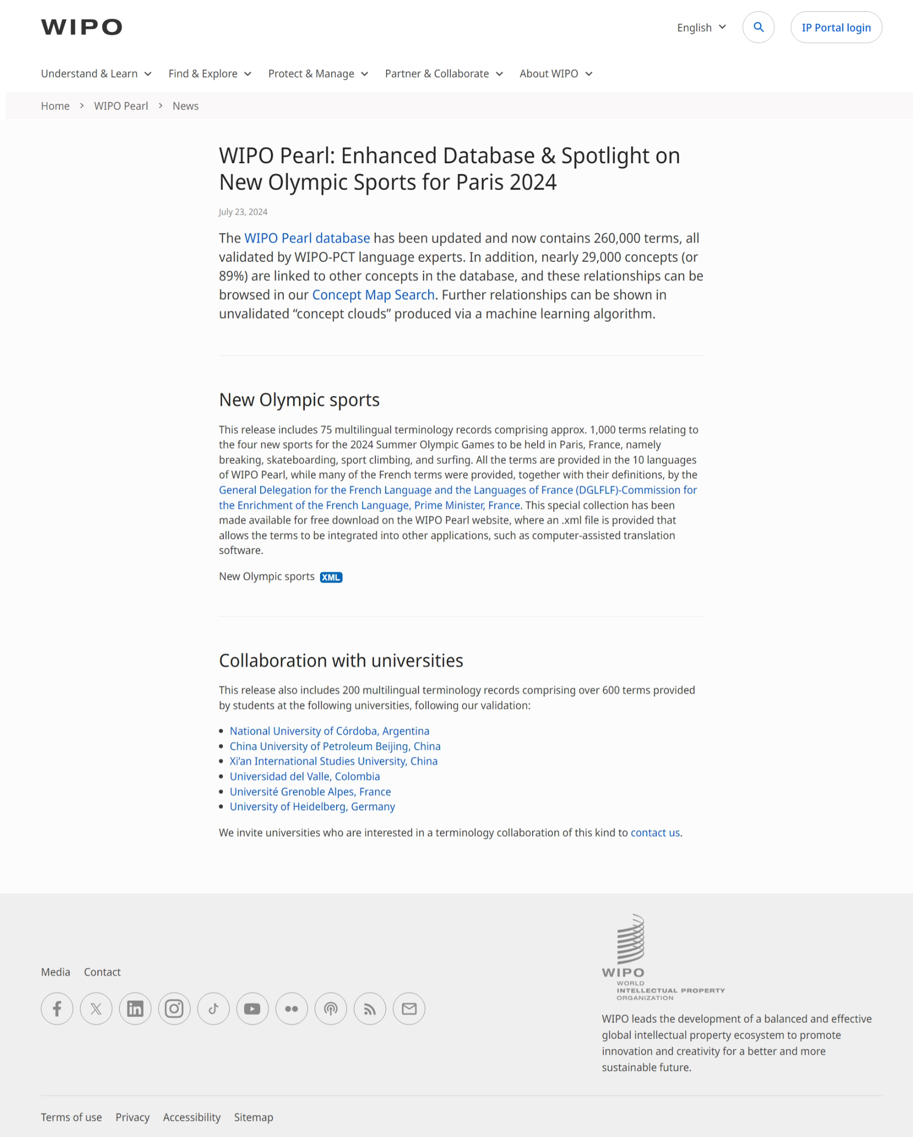 8月5日,联合国世界知识产权组织(World Intellectual Property Organization, WIPO)公布了最新“数据库扩充 & 聚焦2024年巴黎奥运会新项目”,包括200个由合作高校提供的多语言术语条目更新,包含超过600个术语,中国石油大学(北京)作为WIPO合作高校排名第二,在国内高校中排名第一。