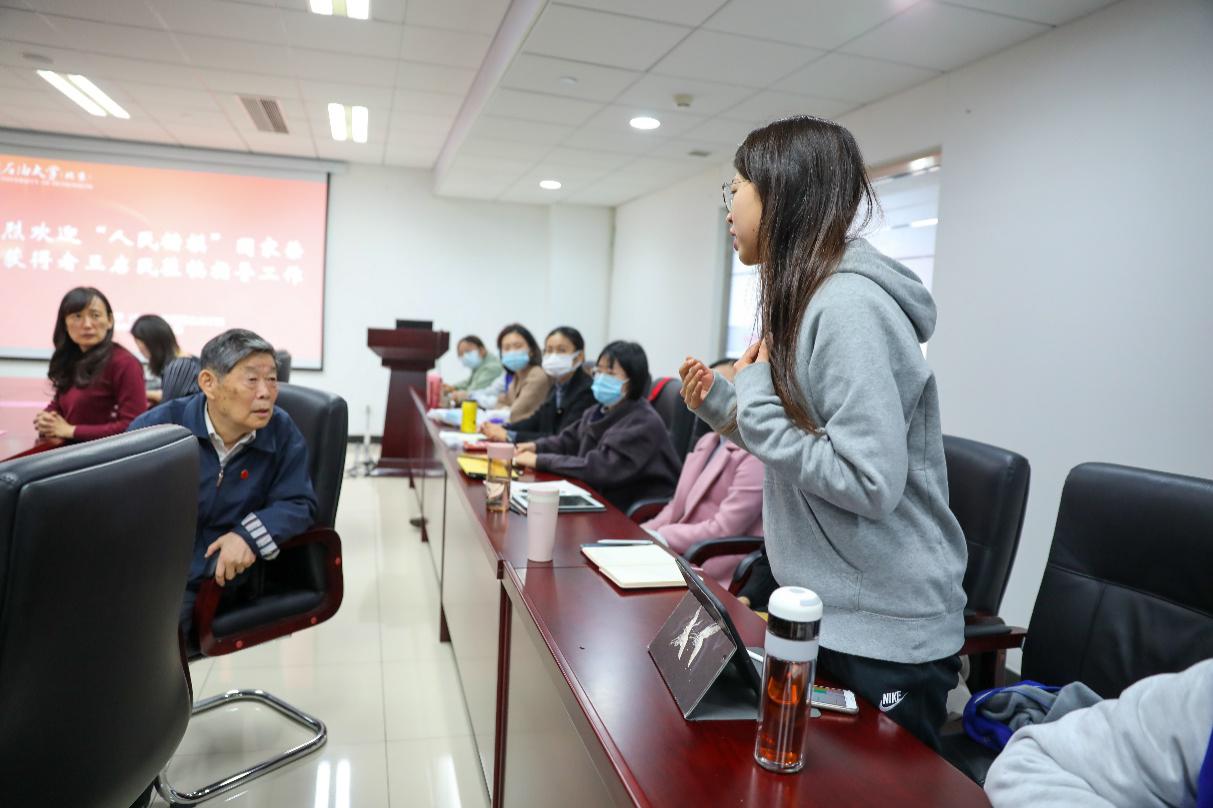 启民校友本次的中石大行,因为年事已高和身体原因,得以成行已经相当不容易。但出乎所有人意料的是,老人家到了校园里,不顾旅途疲乏,48小时内行程满满。第一站,他就参观了“学习回信精神,勇担时代使命”主题展览。在参观过程中,他被路过的马克思主义学院曹培强教授认了出来。曹教授热情地与启民校友交流,他惊喜地发现,眼前这位老人不仅是一位科研狂人,在政治理论方面还有极高的素养,对很多问题有着相当深刻且独到的见解。他感慨道:自己作为思政课老师,常常给同学们讲铁人精神,但直到今天才终于有机会见到“新时期铁人”并当面交流和学习,实在是太激动了。这次偶遇,让曹教授深感幸运,他征得启民校友的同意后,将他们的谈话录音并与启民校友合影,为以后的思政课保留下珍贵的影像资料。但同时,因为启民校友在中石大的行程安排很紧凑,马克思主义学院的其他老师可能就无缘与启民校友当面交流,曹教授为此倍感遗憾。启民校友得知后,不辞辛苦,特意将临动身去机场前的一个小时时间挤出来,与马克思主义学院的青年师生进行交流座谈,回答了马克思主义学院师生的提问,为马克思主义学院题词,为学生签名,并与大家合影留念。启民校友在校的第一站和最后一站都和马克思主义学院有关,所有互动问答都是在马克思主义学院,不能不说是启民校友和马克思主义学院的特殊缘分,这也让马克思主义学院的老师同学们惊喜和获益匪浅!