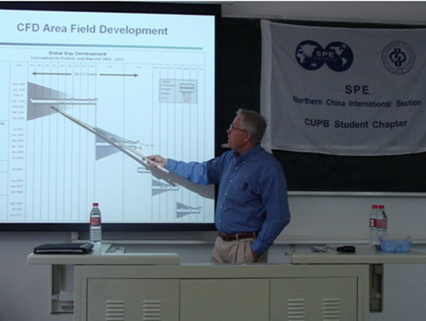 讲座邀请了来自阿纳达科石油公司的中国地区生产经理Michael Long、中国地区现场经理Peter和中国地区生产维护技术专家Kerry。他们全方位地为大家介绍了近海石油工业的发展情况。Michael对渤海湾的生产历史及现状做了概括性介绍,并结合丰富的图表说明阿纳达科公司的生产情况;Peter结合曹妃甸油田的生产实际,详细分析FPSO的组成、结构和功能;Kerry阐述了海上生产停产检修的一般程序及其特殊意义。讲座后,同学们用英语与嘉宾积极交流,内容涉及水质检验和油水分离,FPSO的工作方式以及停产检修的具体操作规程等,三位资深工程师都给与了详细独到的解答。