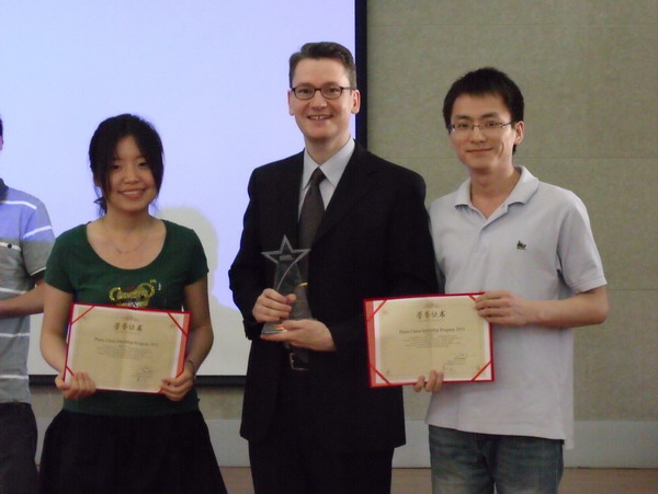 中国能源战略研究中心执行主任王震出席演讲会并致辞。普氏中国能源市场高级总监华大威先生详细地介绍了普氏的运作,并对获得面试机会的同学表示祝贺,以及对在座的同学表达了殷切的希望。华大威先生宣布,经过论文匿名评审和面试两个环节,最终由工商管理学院研究生09级金融专业学生王天然和周芳共同拔得头筹,获得了去新加坡普氏能源资讯实习的机会。