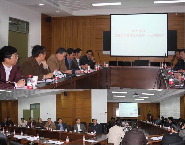 讨论会上,狄帮让教授介绍了物探重点实验室的基本情况和自成立以来取得的研究成果。听取完汇报后,来访专家提出了加强东方地球物理公司与物体重点实验室交流合作的一些具体建议,建议物探重点实验室的研究成果能在东方地球物理公司进行测试、试用。物探重点实验室也表达了与东方地球物理公司加强交流和合作的愿望,希望通过强强联合的方式,实现优势互补,为中国石油集团公司和我国的石油勘探和开发技术的发展作出贡献。
