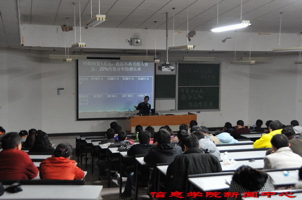 11月28日下午,由地球物理与信息工程学院新闻中心举办的“国际金融与证券投资”讲座在三教105举行。沈友军博士给到场的百余名学生带来了一场精彩的演讲。
