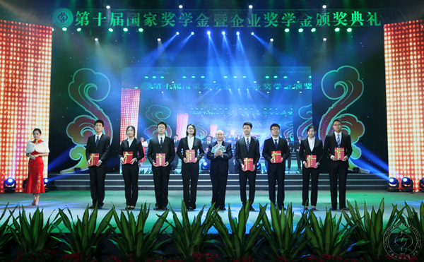 张来斌为获得国家奖学金的学生代表颁发获奖证书。金华、魏文普在第一轮颁奖环节为获奖学生颁奖并发表讲话,充分肯定了石大学子的素质,表达了对获奖学生的祝贺。在第二轮颁奖环节中,大庆油田、胜利油田、塔里木油田、东方地球物理公司等企业代表为获奖学生颁奖并发表真情寄语。