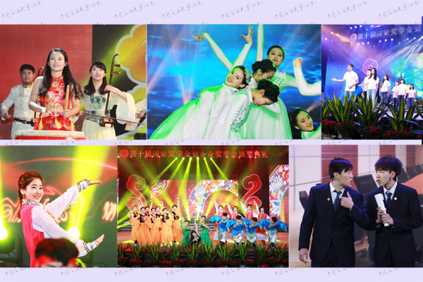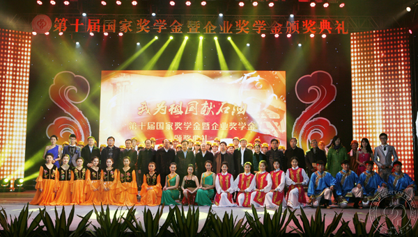 颁奖典礼上,多才多艺的石大学子为各位代表和嘉宾献上了民乐合奏《大漠敦煌》,舞蹈《清清的克拉玛依河》、《青春石油梦》,音诗画《油田上的青春》,话剧《应聘》,合唱《仰望星空》、《青春舞曲》等精彩节目。第十届国家奖学金暨企业奖学金颁奖典礼在《我为祖国献石油》的歌声里落下帷幕。