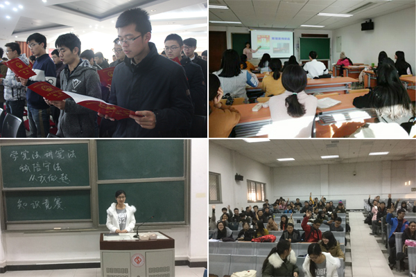 各学院也组织师生开展了形式多样的宪法学习教育宣传活动。12月4日,在国家宪法日当天,机械与储运工程学院举办了“12.4”国家宪法日网络知识竞赛,1400余名师生通过网络在线答题方式参加了知识竞赛,强化了对宪法精神和宪法基本知识的了解和掌握。外国语学院英语15-1班团支部举办召开“学宪法 讲宪法”主题团日活动,同学们通过观看法制教育动画片、PPT展示以及现场演出普法情景剧、回答宪法知识等方式学习法律知识,认识到知法守法的重要性。12月6日,地质工程研16-6班、16-7班、16-8班举办“学宪法讲宪法,诚实守信从我做起”主题知识竞赛,竞赛题目涵盖依法治国、宪法常识、法律知识以及诚信教育等方面内容,竞赛环节包括必答、抢答、举手表决等方式,富有常识性、知识性、趣味性的竞赛使学生拓宽了法律知识视野,提升了自身法律修养。
