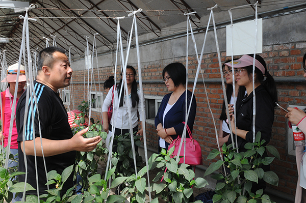 在北京金六环农业园,教师们参观了蔬菜、瓜果的种植培育大棚,聆听了昌平区蔬菜技术推广站副站长陈明远对双网覆盖、节水滴灌、黄板防虫、熊蜂授粉等有机蔬菜生产技术的介绍,了解了农业园的建设发展历程、理念、目标,以及农业园在新技术新品种创新、与北京高校开展产学研合作、支持教师开展社会实践等方面的情况。