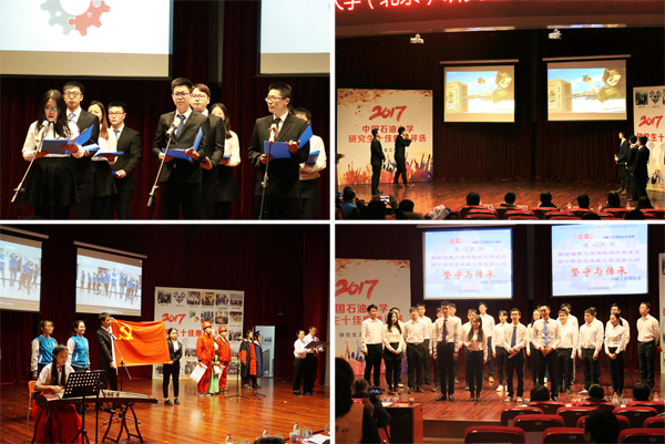 评选会上,晋级决赛的20个集体依次通过视频汇报和现场展示的方式角逐“研究生十佳集体”。视频汇报内容丰富,从党团建设、科研论文、第二课堂和导师寄语等方面展示了集体多年来的建设成果;视频汇报形式多样,既有基于现实的传统影像、也有生动活泼的卡通动漫、还有充满文艺气息的沙画展演。3分钟的现场展示各有特色,同学们用声情并茂的诗歌朗诵表达浓浓师恩、用青春活力的舞蹈剧演绎班级故事、用诙谐幽默的电影配音话说宿舍日常、用妙趣横生的三句半调侃科研生活、用朗朗上口的歌曲改编唱响石油情怀、用清新高雅的古筝配乐传递文化自信、用铿锵有力的大合唱展示青年担当。整个汇报充分展示了导师的育人情怀、班集体的精诚团结、课题组的科研精尖和宿舍的互助友爱。