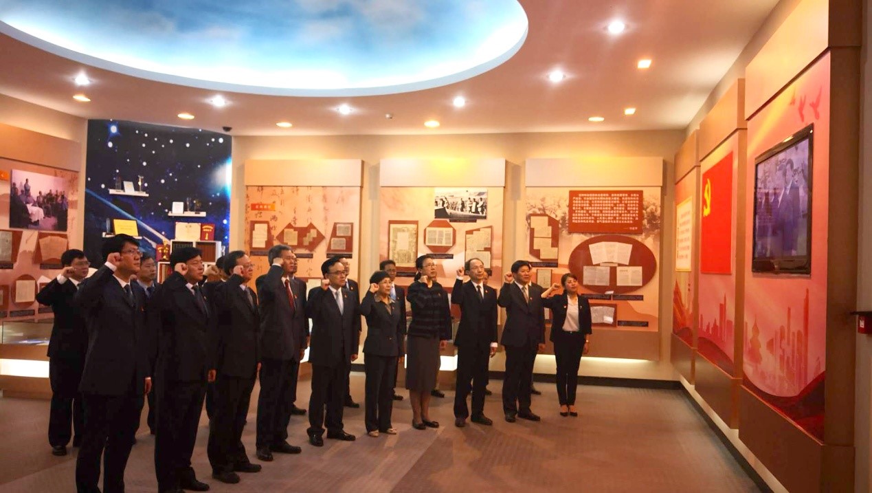 党的十九大结束后,习近平总书记带领其他中共中央政治局常委瞻仰上海中共一大会址和浙江嘉兴南湖红船,回顾建党历史,重温入党誓词。在观展的最后,全体党委委员跟随习近平总书记在一大会址领誓入党誓词的视频,面向党旗,举起右拳,庄严宣誓,表达为实现共产主义远大理想而努力奋斗的坚定政治信念。