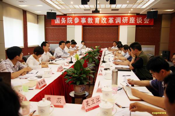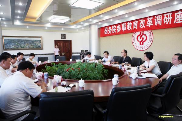 郑虎参事在座谈中表示,教育事关民族兴旺、人民福祉和国家未来,党中央、国务院历来高度重视教育事业,把教育放在优先发展的战略地位。由温家宝总理亲自主持制订 《国家中长期教育改革和发展规划纲要》是指导教育改革和发展的纲领性文件。此次国务院参事室经国务院领导同志同意成立深化教育体制改革调研小组,分赴各地就教育改革问题开展调查研究,就是要广泛听取专家学者、一线教育工作者、学生等各方的意见,力争使该规划纲要真正让人民群众满意,符合中国国情和时代发展的要求。中国石油大学是一所有着优良传统和鲜明办学特色的大学,校领导和师生代表的一些思想观点和对策建议思考深刻、针对性强,很有启发性和代表性,对于进一步完善规划纲要具有重要参考价值。