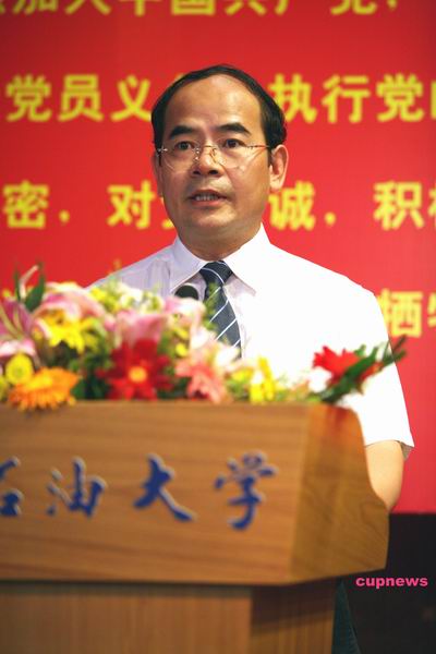 蒋书记强调,2009年学校学习实践科学发展观活动正在不断走向深入;我们也即将迎来伟大祖国60周年华诞,这对广大党员领导干部和师生员工提出了新的要求。他简要回顾了党的光辉历程,并指出,多年来中国石油大学与伟大的党、伟大的祖国一同走过了光荣而曲折、坚实而豪迈的历程。学校每一次发展战略的确立,每一次历史性的跨越,每一次石大精神的升华,都铭刻着全体石大人团结一致、艰苦奋斗、开拓进取的足迹;都凝结着全体共产党员和广大教职员工的智慧、心血和汗水;都昭示着石大人虽饱经沧桑而石大精神不老,虽历经磨难而报国之志永存的激情与豪迈。