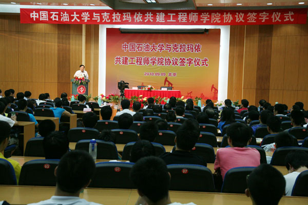 校长张来斌在讲话中强调,共建工程师学院不仅对克拉玛依市的发展具有重要的推动作用,而且对中国石油大学的发展也具有里程碑的意义。他说,《国家中长期教育改革和发展规划纲要》要求高校积极探索“政产学研”相结合的办学体制,培养具有实践创新能力的优秀人才。长期以来,中国石油大学在“政产学研”相结合方面已经做了很多有益的探索和实践,此次合作正是中国石油大学对“政产学研”办学模式的进一步深化。其次,在高等教育快速发展的今天,中国石油大学要建设世界石油石化学科领域世界一流研究型大学,就一定要强调开放性,树立开放办学的理念。一直以来,中国石油大学和新疆油田以及克拉玛依市在科学研究、人才培养等方面有着密切的合作,此次双方合作在克拉玛依市建立工程师学院,是中国石油大学实施开放式办学的重要举措,不仅拓展了学校的办学资源,进一步加强了学校与地方政府和企业的合作,而且最重要的是为培养卓越工程师、培养专业学位研究生创造了良好条件,在推动“政产学研”联合培养人才方面迈出的新的步伐。