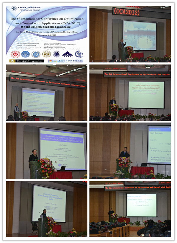 12月8日,由中国石油大学、重庆大学、重庆师范大学、重庆市科学技术委员会、自然科学基金委、湖南大学、上海大学、首都师范大学和Curtin大学等主办,中国石油大学承办的第五届最优化与控制及应用国际会议(OCA2012)在翠宫报告厅闭幕。来自中国、美国、加拿大、澳大利亚、俄罗斯、日本等近20个国家和地区的200余位嘉宾出席了会议。