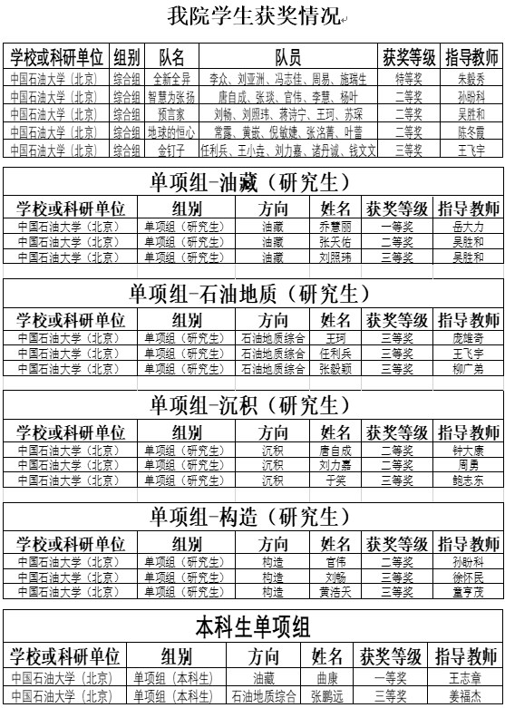 在2017年10月22日结束的第二届全国油气地质大赛上,我院学子表现出色,经过激烈的角逐,由2015级研究生李众、刘亚洲、冯志佳、周易、施瑞生组成的“全新全异”队斩获大赛最高奖项:综合组特等奖。2016级研究生乔慧丽获得研究生单项组油藏评价方向一等奖,曲康获得本科生单项组一等奖。此外,我院学子还获得综合组二等奖3项,三等奖1项,研究生单项组二等奖4项,三等奖7项,本科生单项组三等奖1项。岳大力、王志章、朱毅秀三位教师获大赛优秀指导教师。由我院学生杜一帆、杨慧、曹天宇组成的中国石油大学(北京)代表队荣获知识竞赛二等奖。