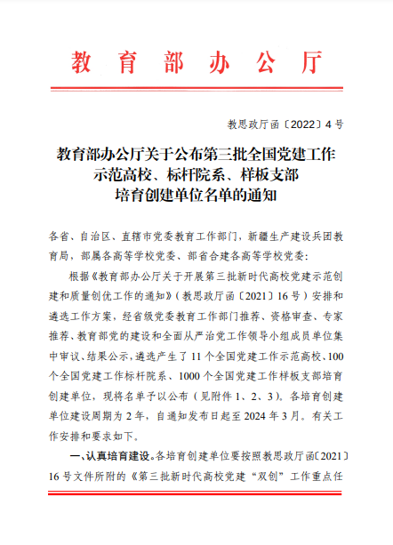 近日,教育部办公厅印发《关于公布第三批全国党建工作示范高校、标杆院系、样板支部培育创建单位名单的通知》(教思政厅函〔2022〕4号),中国石油大学(北京)地球科学学院油气勘探与开发地质系教工党支部入选第三批“全国党建工作样板支部”培育创建单位名单,建设周期为2022年3月至2024年3月。