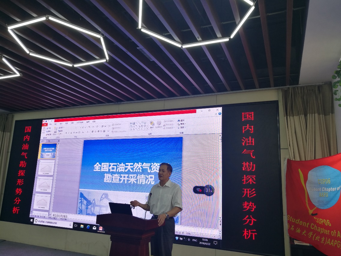 2018年6月22日上午,油气勘探与开发地质系与AAPG学会分会邀请自然资源部中央地质勘查基金管理中心主任车长波研究员,主讲了第十九期学术沙龙“全球油气资源形势”。学术沙龙由刘成林教授主持,有30余名师生参加了此次学术活动。
