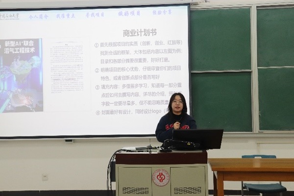 化学工程与环境学院2023级博士研究生邵凡、新能源与材料学院2021级本科生张田慧、非常规油气科学技术研究院2021级研究生王玮围绕赛前报名、项目选题、如何组队、商业计划书撰写、PPT制作、路演汇报等方面分别做分享。