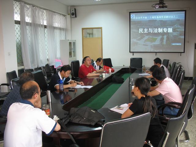 人文社科部政治学教研室“庆祝改革开放三十周年” 系列学术活动之二“民主、法制的理论与实践研讨会”于2008年6月5日下午2:30——5:30,在人文社科部会议室举办。会议由庞昌伟教授主持,部主任胡新华,部党总支书记肖中琼,部副主任李卫红参加了会议,并就各个主题同教研室的老师们进行了深入的探讨。