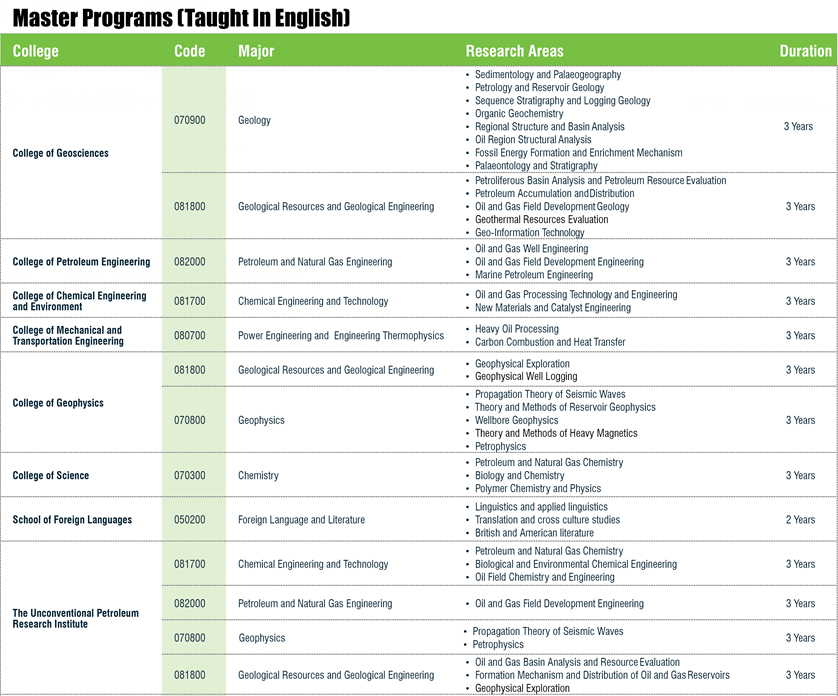 В начале 21-го века, когда нефтяная отрасль в Китае реализовали стратегию Выхода в глобальное пространство, спрос на перспективных специалистов международного уровня и инновационного направления резко возрастает. Китайский нефтяной университет пропагандирует интернационализацию обучения студентов магистратуры и аспирантуры, чтобы самому выйти на уровень ведущего университета в нефтяных и нефтехимических исследованиях и лучше служить мировой энергетической отрасли. Китайский нефтяной университет установил партнерские связи со многими лучшими мировыми университетами, а также корпорациями, включая Китайскую национальную нефтегазовую корпорацию, Китайскую нефтяную и химическую корпорацию, Total, Национальную нефтяную компанию Абу-Даби, которые спонсировали активное участие студентов магистратуры и аспирантуры в международных и национальных работах. Опираясь на десятилетний опыт поиска и практической работы, вуз выстроил трехуровневую систему обучения в магистратуре и аспирантуре вида государство-провинция-университет и успешно запустил ряд международных образовательных проектов, включая программы, поддерживаемые Китайским советом по стипендиям и Пекинским комитетом муниципального образования, а также программы двойного диплома, магистерские программы с преподаванием на английском языке и т.д. В качестве одного из 18 членов Китайско-европейской платформы технического образования (SEEEP) Китайский нефтяной университет сотрудничает с Техническим университетом Каталонии и совместно предлагает программу со специализацией в области новых и экологически чистых источников энергии, что имеет исключительное значение для развития Китайско-европейской платформы технического образования.