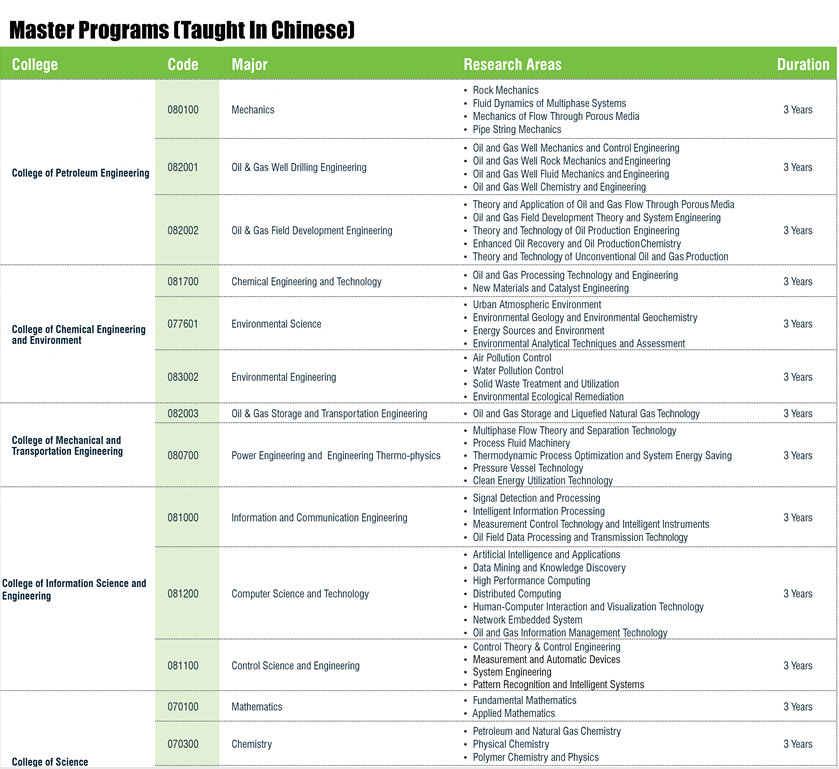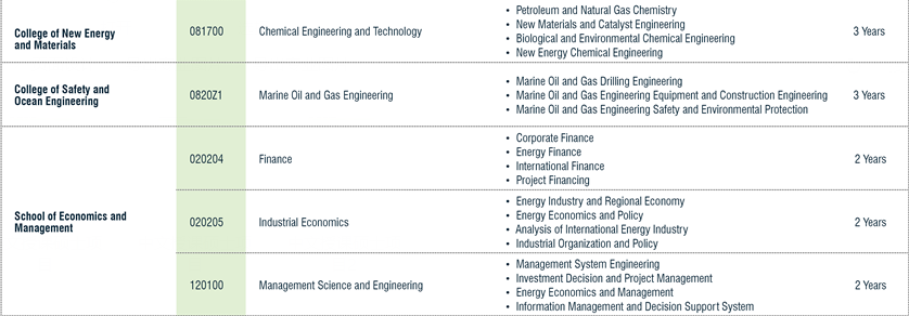 Китайским нефтяной университет уполномочен присуждать степени доктора и магистра по 8 дисциплинам, включая философию, экономику, юриспруденцию, педагогику, литературу, естественные науки, технические науки и менеджмент. По некоторым специальностям, таким как нефтегазовое дело, геологические ресурсы, инженерная геология, технология и проектирование безопасности, геология и химическая технология, университет является лидером в масштабах страны. Новые источники энергии, глубоководные технологии и технологии охраны окружающей среды переживают сейчас бурное развитие. Помимо научных степеней, Китайский нефтяной университет присуждает ряд профессиональных степеней, включая магистра инженерного дела (в 20 профессиональных областях), магистра делового администрирования (MBA), магистра профессионального ведения бухгалтерского учета (MPAcc), магистра переводческого дела, магистра финансов и магистра преподавания китайского языка как иностранного (MTCSOL).
