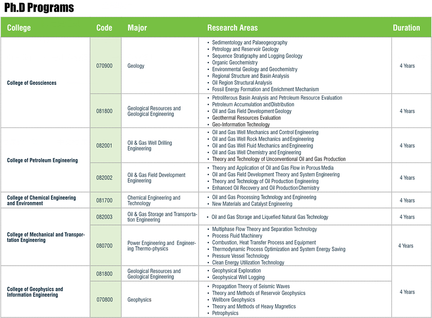 В последние годы Китайский нефтяной университет стремится создать научно-исследовательский университет мирового класса, непрерывно адаптируя и совершенствуя свою систему подготовки специалистов высокого уровня и прикладывая усилия для создания конкурентоспособной академической среды. Устремляясь в будущее, образование в магистратуре и аспирантуре будет продолжать фокусироваться на принципах человеко-ориентированных реформ и инноваций с оптимизацией структуры и акцентом на уникальных характеристиках, улучшении качества и достижении выдающихся результатов. Служа стратегии национального энергетического развития, мы уже выработали продуманную и завершенную систему образования с прицелом на воспитание высококлассных перспективных специалистов и инноваторов, перед которыми открываются международные горизонты. Магистратура и аспирантура Китайского нефтяного университета привержены климату многообразия на территории кампуса, улучшению опыта обучения, а также развитию во всех своих студентах сознания гражданина мира.