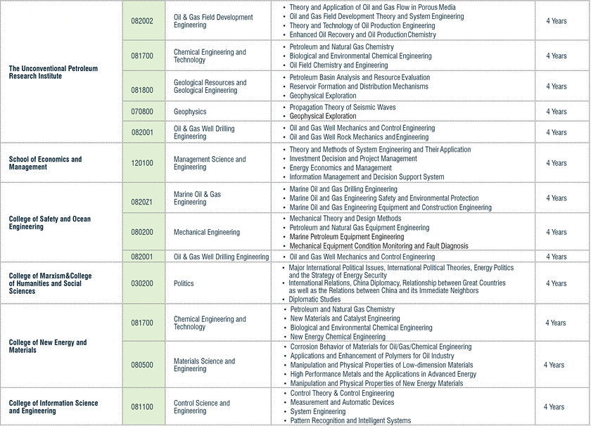 Китайским нефтяной университет уполномочен присуждать степени доктора и магистра по 8 дисциплинам, включая философию, экономику, юриспруденцию, педагогику, литературу, естественные науки, технические науки и менеджмент. По некоторым специальностям, таким как нефтегазовое дело, геологические ресурсы, инженерная геология, технология и проектирование безопасности, геология и химическая технология, университет является лидером в масштабах страны. Новые источники энергии, глубоководные технологии и технологии охраны окружающей среды переживают сейчас бурное развитие. Помимо научных степеней, Китайский нефтяной университет присуждает ряд профессиональных степеней, включая магистра инженерного дела (в 20 профессиональных областях), магистра делового администрирования (MBA), магистра профессионального ведения бухгалтерского учета (MPAcc), магистра переводческого дела, магистра финансов и магистра преподавания китайского языка как иностранного (MTCSOL).