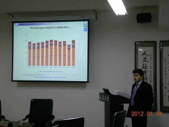2012年1月4日下午,应我院国际石油政治研究中心邀请,俄罗斯能源部能源战略研究院副院长阿列克谢·格罗莫夫为国际政治专业师生用熟练的英语作了题为《俄罗斯天然气工业发展前景》的学术报告。格罗莫夫介绍了《俄2030年能源战略》和俄气天然气发展战略、俄天然气出口战略中的传统欧洲市场和独联体市场、LNG出口战略、东向战略瞄准新兴亚太市场及对华管道供气管线方案以及气源地建设、天然气开发税种和运输费率问题等与我院师生进行了热烈的互动式研讨。中油集团中俄合作部天然气专家出席了报告会并俄与专家就氦气提取、俄气价格公式和资源税制进行了交流。