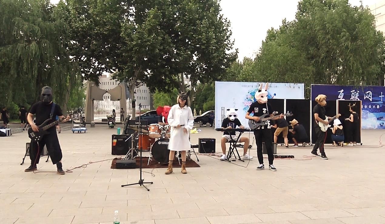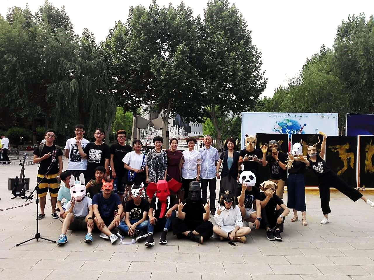 在这个原本平静的下午,掀起了一场涂鸦与音乐的狂欢。两个社团的同学都身着一袭黑衣带着立体的动物面具,个性张扬的造型吸引了很多观众,让人眼前一亮。