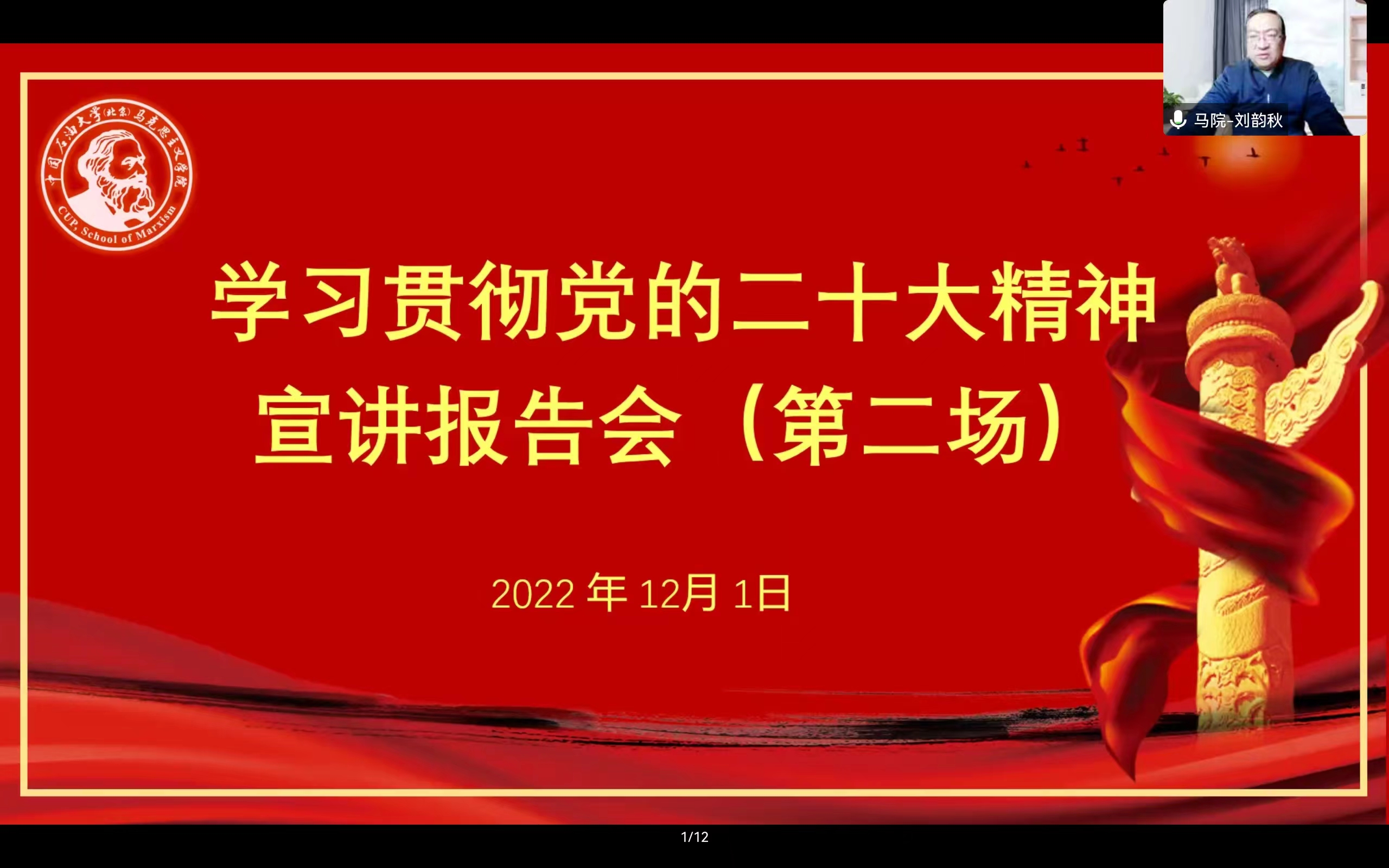 为进一步深入推动习近平新时代中国特色社会主义思想和党的二十大精神入脑入心,12月1日,马克思主义学院党委组织开展第二场学习贯彻党的二十大精神示范宣讲活动。马克思主义学院庞昌伟、李静静、余燕飞和2019级学生徐驰翀四位师生分别进行主题宣讲。马克思主义学院师生、学校青马班和百优宣讲团等成员,共计120余人听取了报告。报告会由马克思主义学院党委书记刘韵秋主持,马克思主义学院院长张明明进行了点评。
