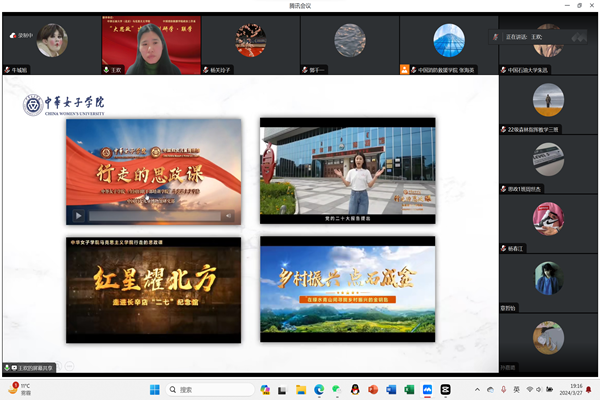 中国石油大学(北京)马克思主义学院思政专业负责人杨关玲子主持联学活动,中华女子学院马克思主义学院院长王欢作了“行走的思政课”实践教学新探索主题报告。王院长介绍了“行走的巾帼思政课”全景式实践教学模式:一是从小切口推动党的创新理论与思政课实践深度融合,二是借助学院特色结合网络特点打造与时俱进的线上思政微课,从乡村振兴、党建理论、传统文化等方向着力打磨优秀案例作品。三是通过“四访三送一宣讲”等形式丰富实践内容,细化以学生为中心的要求。