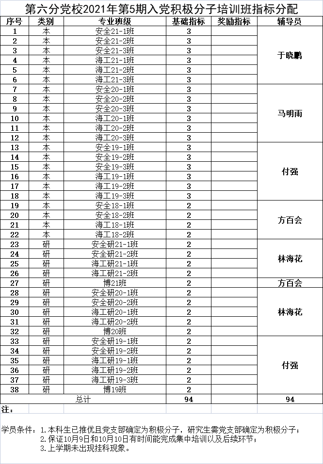 根据《中共中国石油大学(北京)委员会党校工作规则(试行)》,结合学校实际,经党校校务委员会研究决定,安全与海洋工程学院和新能源与材料学院联合成立中国石油大学(北京)第六分党校。党校2021年第5期入党积极分子培训班初步定于10月9日开班。现将有关工作通知如下: