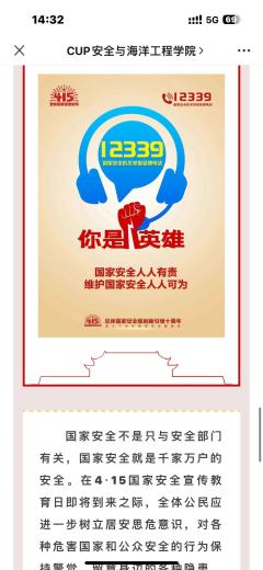 为进一步加强师生树牢总体国家安全观,不断增强全民国家安全意识和素养,提高师生履行国家安全法律责任义务的自觉性和主动性,筑牢国家安全的心理防线和思想防线,为维护国家利益、保证国家长治久安、安全发展,4月10日至15日,中石大安全与海洋工程学院组织开展2024年国家安全教育系列宣传教育活动。