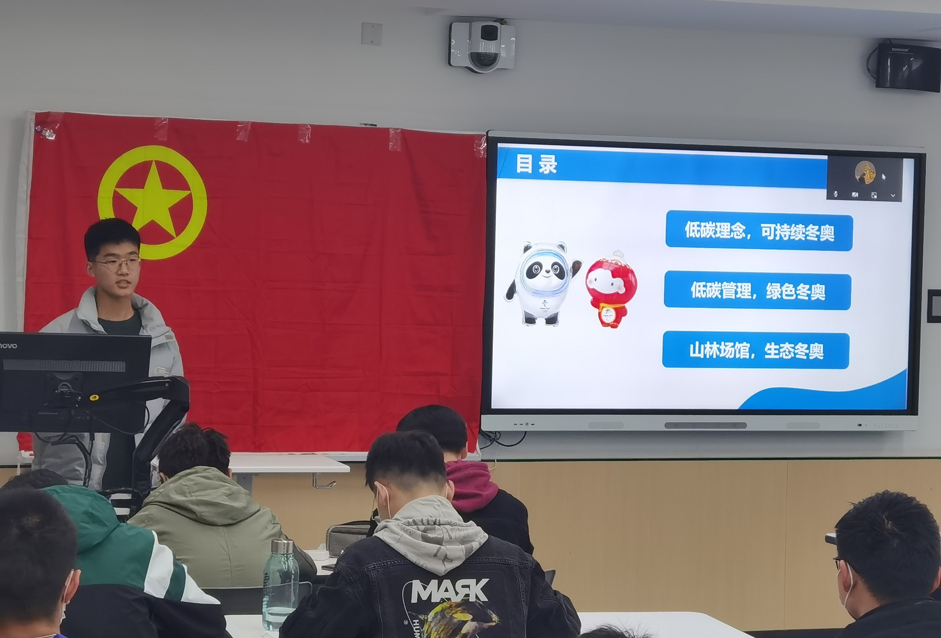 本石工20-1团支部书记刘晓旗的汇报以“绿色冬奥·聚焦双碳向未来”为主题,系统介绍了北京冬奥会及冬残奥会中我国为实现“双碳”承诺所使用的“黑科技”,展现了新时代负责任大国的责任担当。