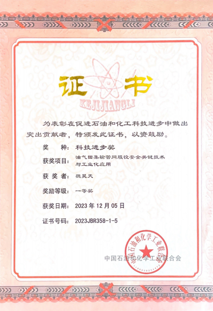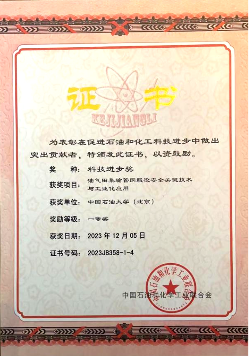 该项目由中石油规划总院牵头,联合中国石油大学(北京)、大庆油田、长庆油田和西南油气田等多家单位,历经5年研发应用,成功地开发出一系列油气田集输管网服役安全关键技术。其中魏昊天博士研发的集输管道高通过性内检测技术与装备,实现了复杂结构管道、复合缺陷的精细化描述,检测精度大幅提高;并提出了一种射流清管器结构阻力计算方法及装置,有效解决了油田集输管道结蜡、胶质沥青质沉积导致清管效果差的难题。通过应用该技术成果,油气田集输管网的安全问题得到了显著改善,大大提升了油气田运营的效率和安全性。