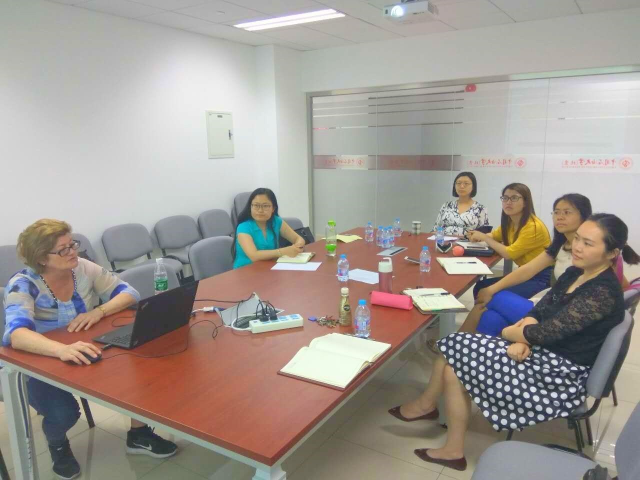 2017年6月2日,工商管理学院召开第三次全英文教学团队讨论会。本次讨论会由Monica Thiel博士向大家介绍美国的课程体系,以本科课程《经济学原理》为例,向大家展示英文教学大纲、教材、教学幻灯片的样例。