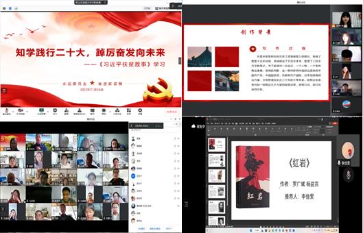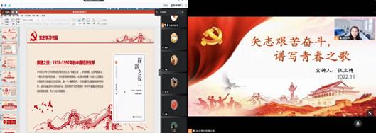 最后各支部书记面向各支部所辖党员和积极分子开展宣讲,开展微党课录制,各支部以党的二十大报告内容根据自身情况开展系统学习活动。其中经济管理学院学硕第三党支部还邀请到了中国石油大学(北京)党的二十大精神宣讲团成员张立博同志,在线上为大家展开了“矢志艰苦奋斗,谱写青春之歌”的主题宣讲。张立博同志分别从习近平总书记对青年的寄语、改革时期艰苦奋斗的意义、新时代下艰苦奋斗的内涵三个方面与大家进行了交流。